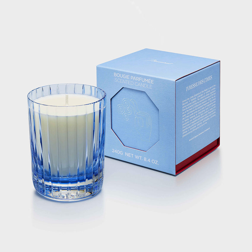 The Ivresse des Cimes (Euphoria of the Peaks) scented candle is part of the Baccarat Four Elements scented candles collection, spring-summer edition. The collection includes four unique fragrances inspired by the essential elements of life - earth, water, air, and fire. This candle invites you to take a refreshing walk in nature, releasing a scent of cypress, eucalyptus and sandalwood. Crafted from French wax made from natural vegetable and mineral sources, and a stunning Baccarat crystal pot, it diffuses a distinct aroma.