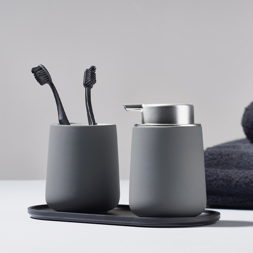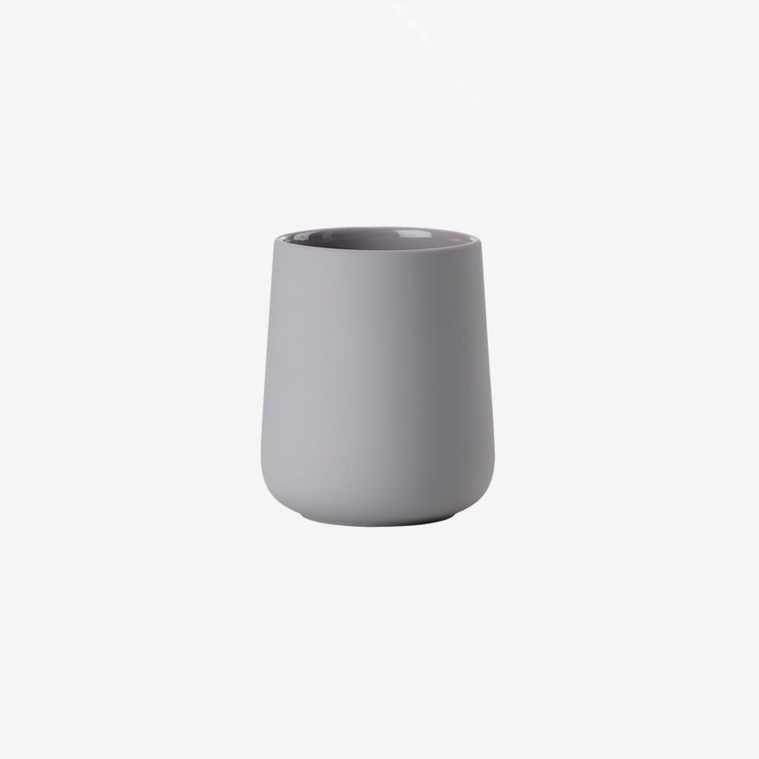 The Zone Nova Toothbrush Mug has been designed with a minimalistic approach for an elegant modern aesthetic. This mug is offered in a selection of solid, matte colors to create a sophisticated upgrade to any bathroom. Its unique design allows for efficient air-drying while keeping the countertop organized. A practical yet stylish addition to any restroom, this painted porcelain mug features a matte exterior with a glazed interior.