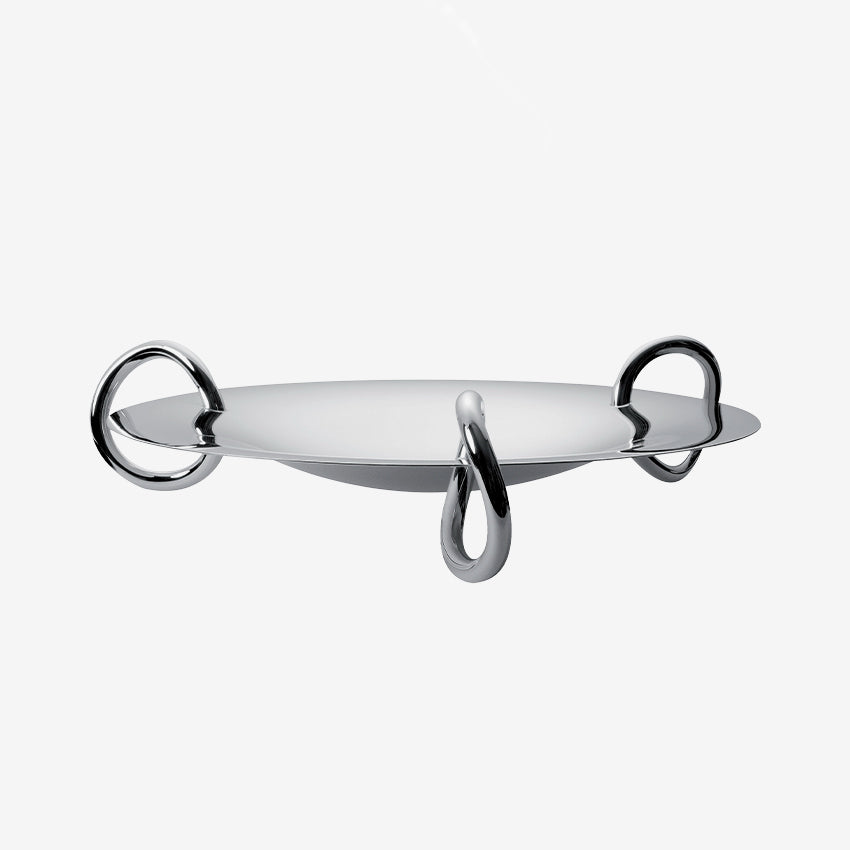 This Vertigo centrepiece bowl is silver-plated, introducing a modern and stylish look to your table setting. Use it as a stand-alone table accent or fill it with floral arrangements, fruits, or candles on top of the piece. Andrée Putman designed this collection featuring a subtly asymmetrical, thick ring with a playful orientation and this piece features this design as its legs for an elevated look. Add this bowl to your home decor to achieve a sophisticated effect or for practical purposes.