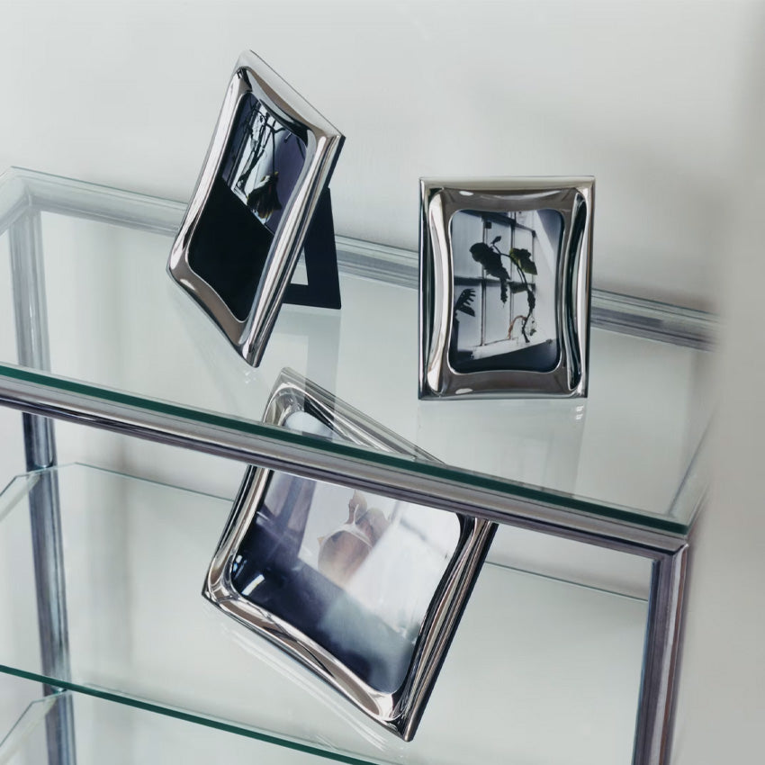 This picture frame showcases the iconic flowing shapes of the renowned Cobra collection, expertly crafted from mirror-polished stainless steel. Its innovative magnetic design secures the frame, enabling it to stand on a desk in both portrait and landscape modes or to be conveniently mounted on a wall, providing a stylish and versatile way to showcase your cherished memories.