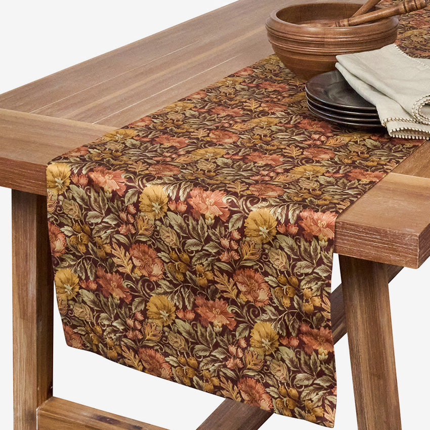 Drawing inspiration from vintage fabrics, this table runner features a captivating blend of romantic flowers and woven leaves in warm, earthy shades, bringing a sense of refined natural beauty to your dining space.