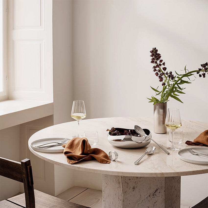 This stainless steel bowl from Georg Jensen's Cobra collection boasts a softly curved, almost fluid shape. It emits a sense of movement that catches the eye, making it an excellent conversation starter. The perfect size for serving salads, rice, and vegetables, it adds a contemporary flair to mealtimes, especially when paired with other pieces from the same collection. The renowned German designer Constantin Wortmann's tableware showcases a sculptural style that always keeps functionality in mind.