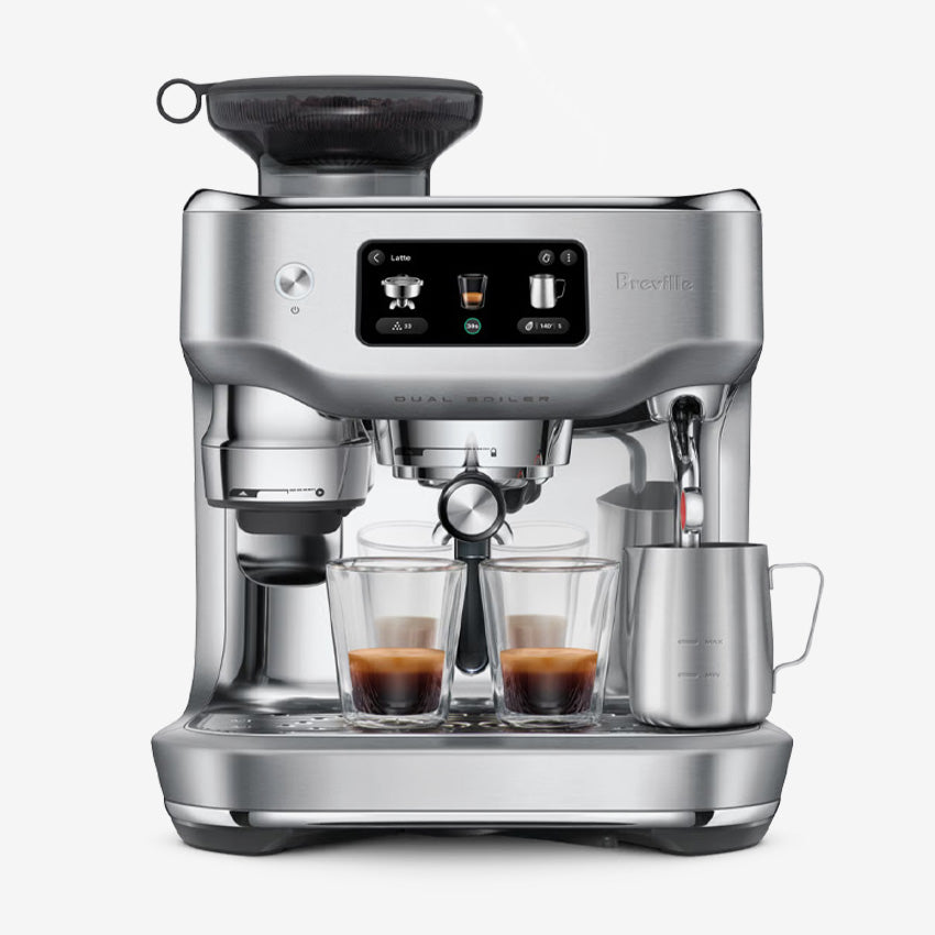 The most advanced Oracle ever, with a powerful Quad-Core CPU that enhances the highly responsive 5.7" touch screen letting you switch between two modes. Sit back and relax on Auto or take control in Manual mode. Enjoy an authentic café experience at home with powerful stainless steel dual boilers for simultaneous extraction and steaming. New Auto Dial-In system monitors each extraction and helps to improve your next espresso shot. Auto MilQ™ delivers silky microfoam hands-free, with settings optimized for dairy, soy, almond and oat. Plus, use the new Breville+ Coffee App to remotely power on and pre-heat your machine.