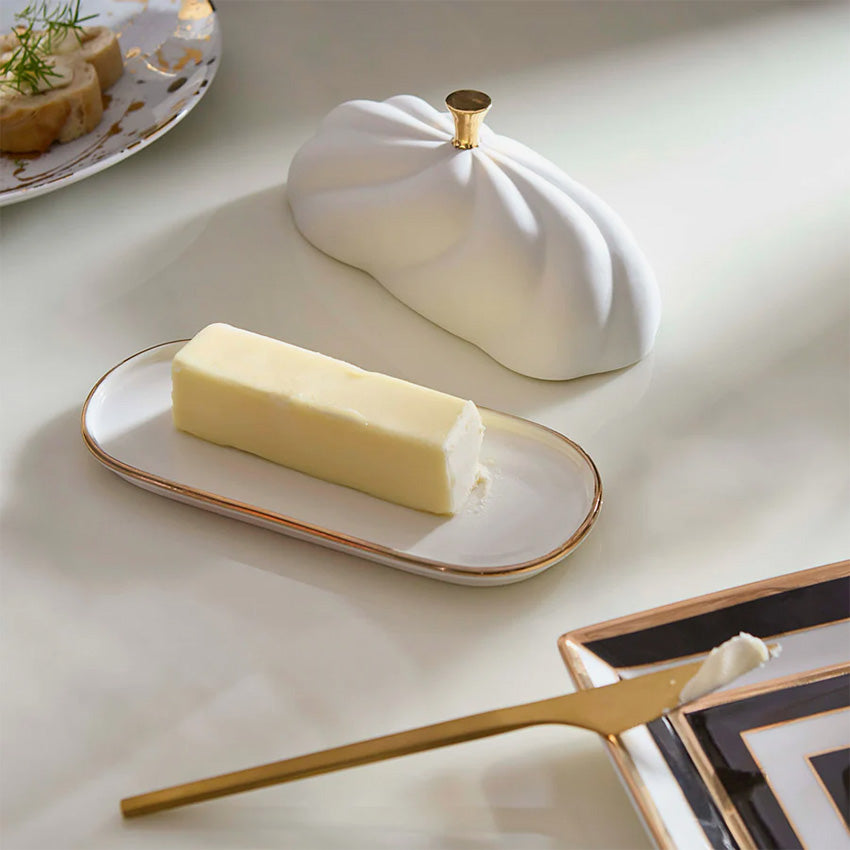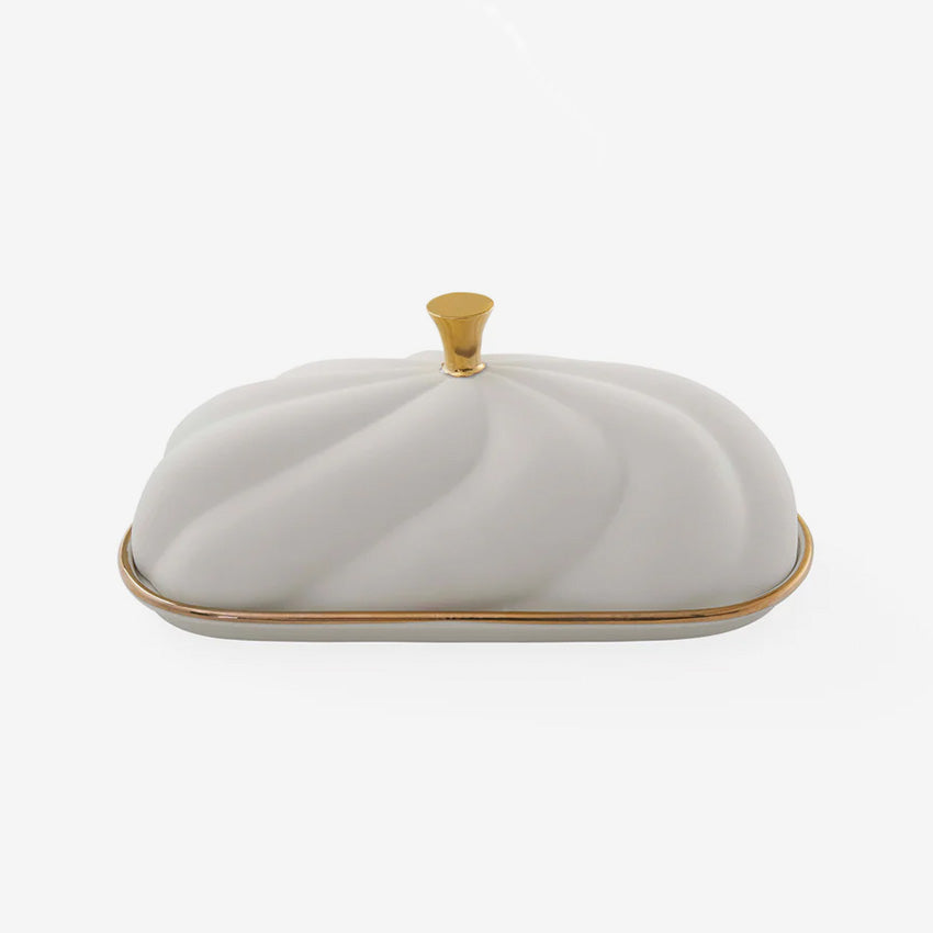 Inspired by 80s glamour, the Geneva Butter Dish showcases a bold, oversized rope motif made from high-fired unglazed porcelain with luxurious gold accents. It’s the perfect statement piece to elevate any stylish table setting.
