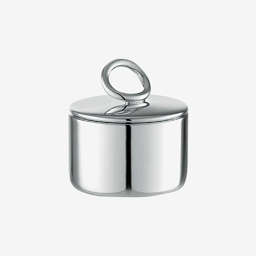 Le sucrier à couvercle Vertigo de Christofle est plaqué argent et constitue un complément élégant et contemporain à tout service de boisson. Le motif caractéristique de la collection Vertigo est un anneau épais et asymétrique. La collection a été conçue par Andrée Putman et figure sur chaque article. Le bol est idéal pour conserver le sucre frais et le présenter avec élégance sur votre comptoir.