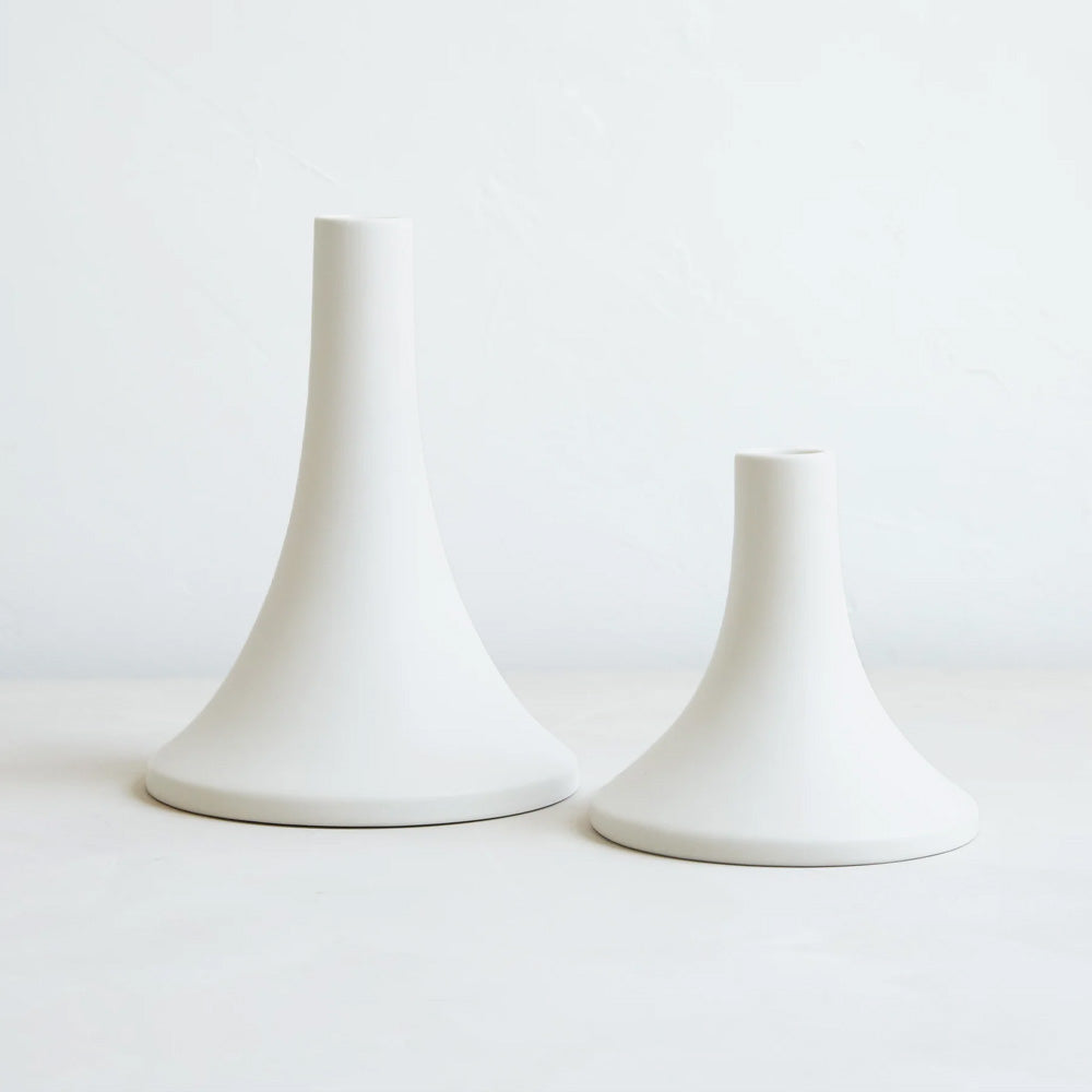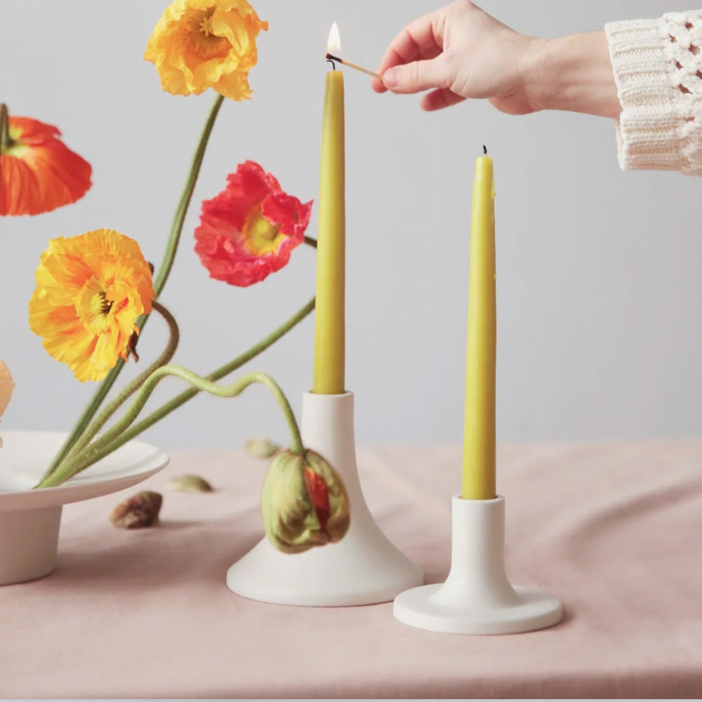 Elevate your candle display with these stunning ceramic taper holders from THE FLORAL SOCIETY. Featuring a sleek matte finish and thoughtful design, each holder accommodates standard taper candles beautifully—whether displayed individually or grouped together for maximum impact. Hand-finished craftsmanship ensures every piece is uniquely special.