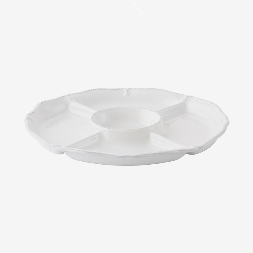 Issu de la collection Berry & Thread, ce plateau est doté d'un bol central pratique pour les sauces et de quatre sections à bords festonnés ornées du motif emblématique de Berry & Thread. Son élégante finition blanchie transforme de simples crudités en une présentation raffinée pour vos apéritifs.