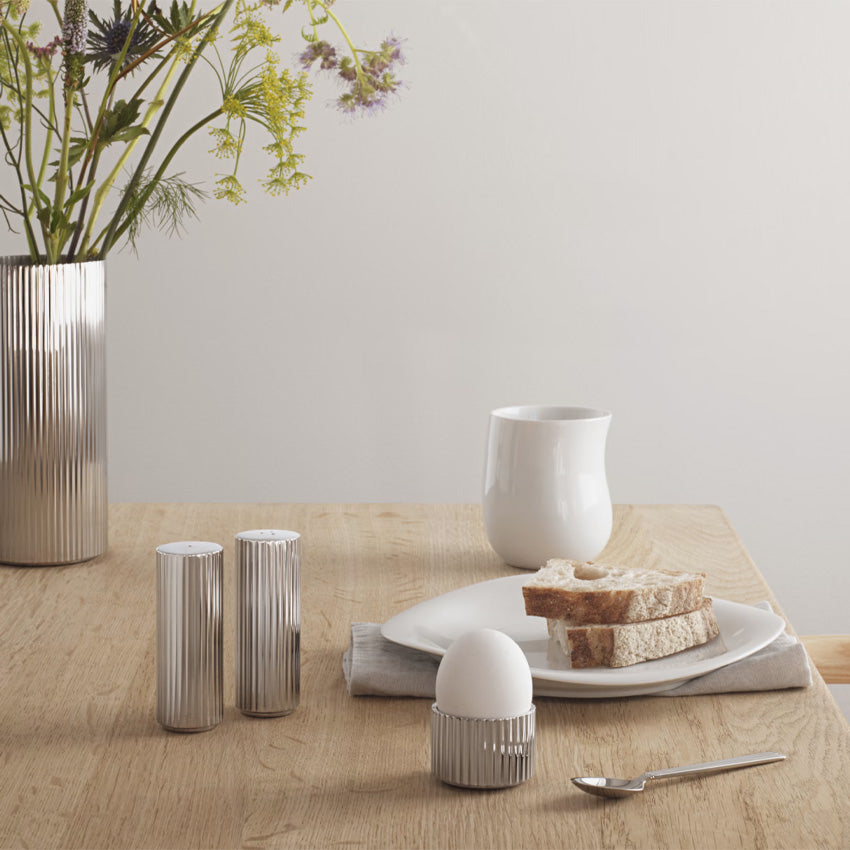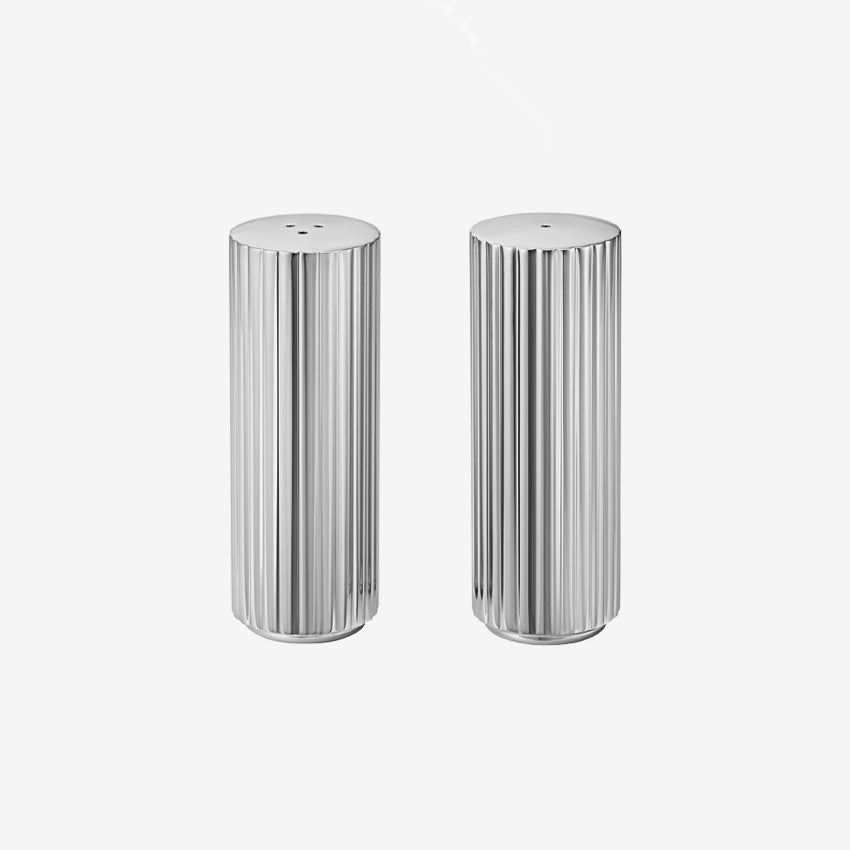 A stunning pair of stainless steel salt and pepper shakers from Georg Jensen's iconic Bernadotte collection. Designed with timeless elegance, they make an exceptional gift for any home.