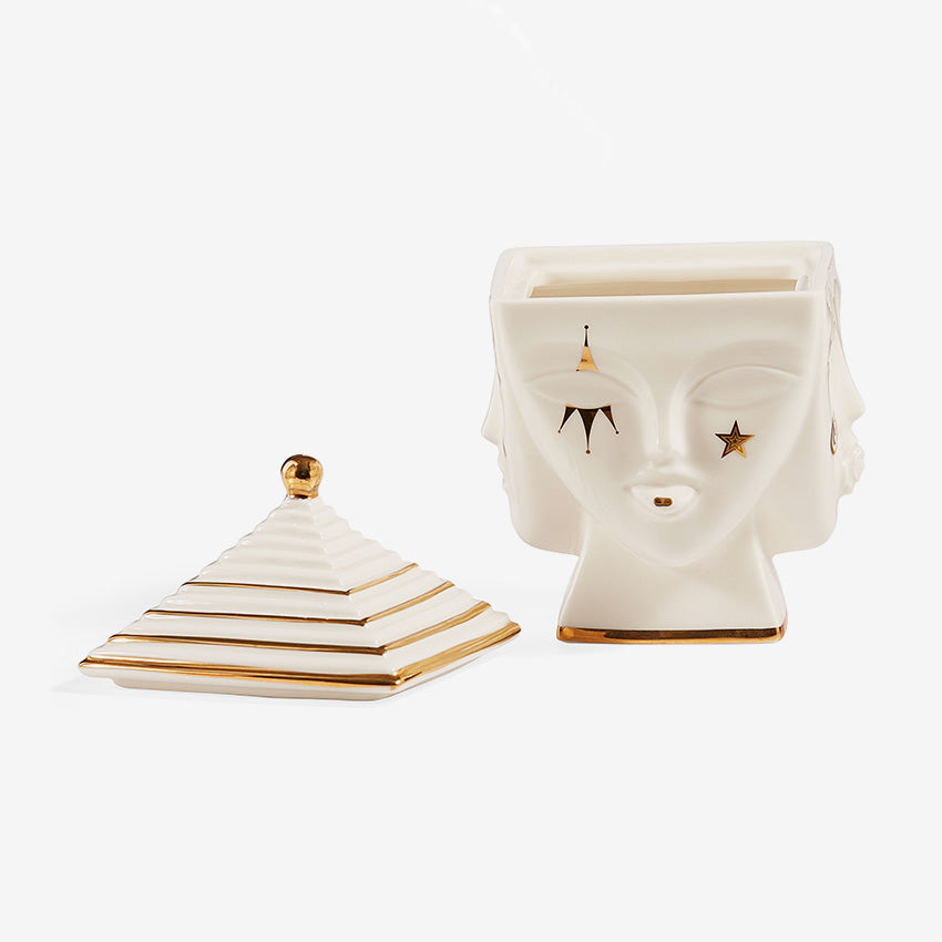 Découvrez la boîte à bijoux Gilded Muse, où fantaisie et fonctionnalité se conjuguent. Ce trésor sculptural présente quatre visages énigmatiques ornés de motifs géométriques audacieux et de reflets dorés scintillants, autant de sujets de conversation. Réalisé à la main par Jonathan Adler lui-même, ce coffret d'inspiration Art déco célèbre la muse dans toute sa splendeur surréaliste. Idéal pour ranger vos trésors les plus précieux.