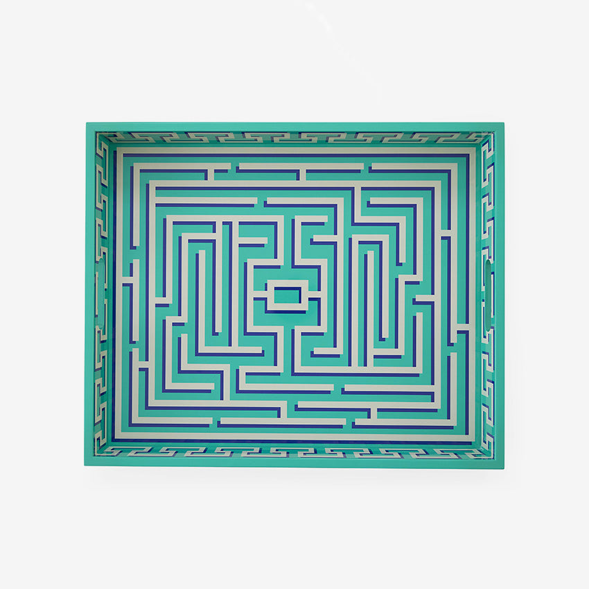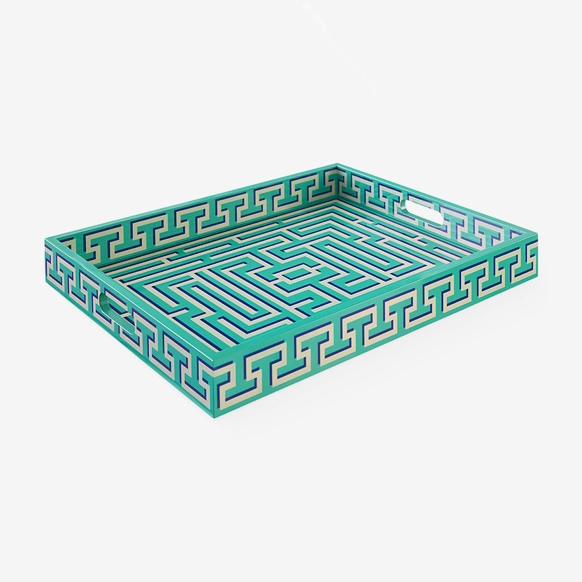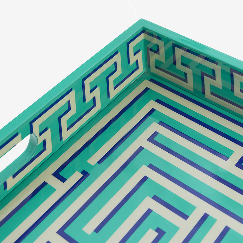 Ce plateau laqué Labyrinth vert de Jonathan Adler transforme le rangement et la décoration du quotidien en une pièce maîtresse design. Sa laque verte éclatante et son motif labyrinthique hypnotisant attirent tous les regards, de la console de votre entrée à votre table basse de salon.