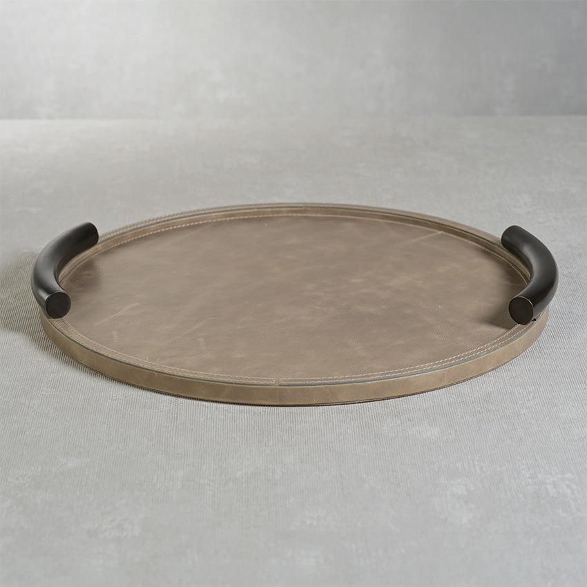 Idéal pour recevoir ou embellir votre espace de vie, ajoutez une touche de raffinement à votre service avec le plateau de service rond Bellecôte. Confectionné avec soin en cuir de vison luxueux et rehaussé d'élégantes poignées en métal noir, ce plateau allie harmonieusement style moderne et matériaux haut de gamme.