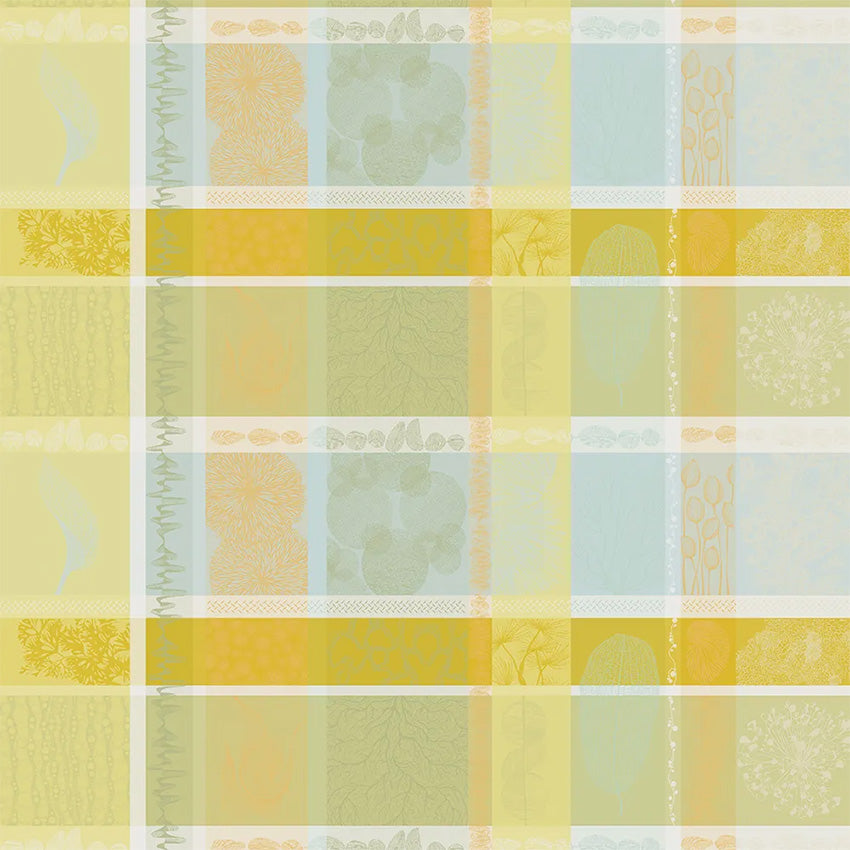 This stunning Garnier Thiebaut Mille Lieues Aube Tablecloth is crafted from exquisite 100% extra-long staple cotton. This tablecloth, made from high-quality cotton jacquard and expertly woven in France, features a charming plaid-inspired pattern accented with delicate floral motifs in vibrant summer hues.